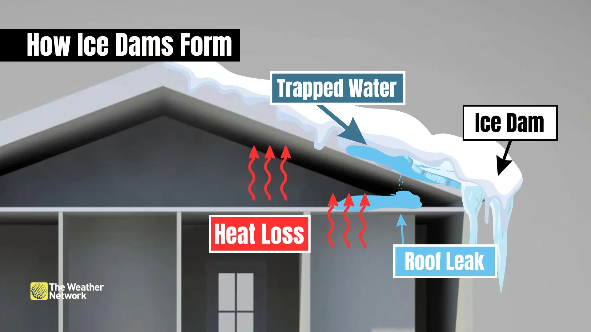 Heat escapes; melts the snow; water freezes; the dam grows. You pay.